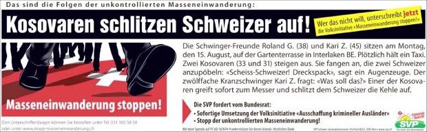 Dass die SVP gerne für ihre politische Agenda die Volksstimmung ausnutzt, ist kein Geheimnis. Die SVP warb am 19. August 2011 auf ihrer Website mit dem Inserat für die Masseinwanderungsinitiative. Sie erschien auch in der Neuen Zürcher Zeitung und im St. Galler Tagblatts.